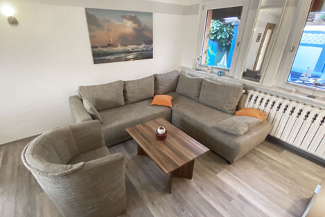 Bettenbelegung: Schlafzimmer: 1 Doppebett, 1 Einzelbett; Wohnzimmer: ausziehbare Schlafcouch.
