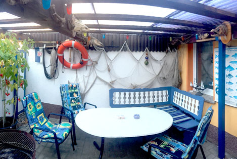 Die urige Terrasse lädt zum Grillen, Lesen, Klönen u.s.w. ein. Ist das Auto auf dem eigenen Parkplatz abgestellt, bräuchte man es den ganzen Urlaub kaum mehr bewegen.